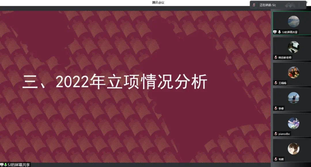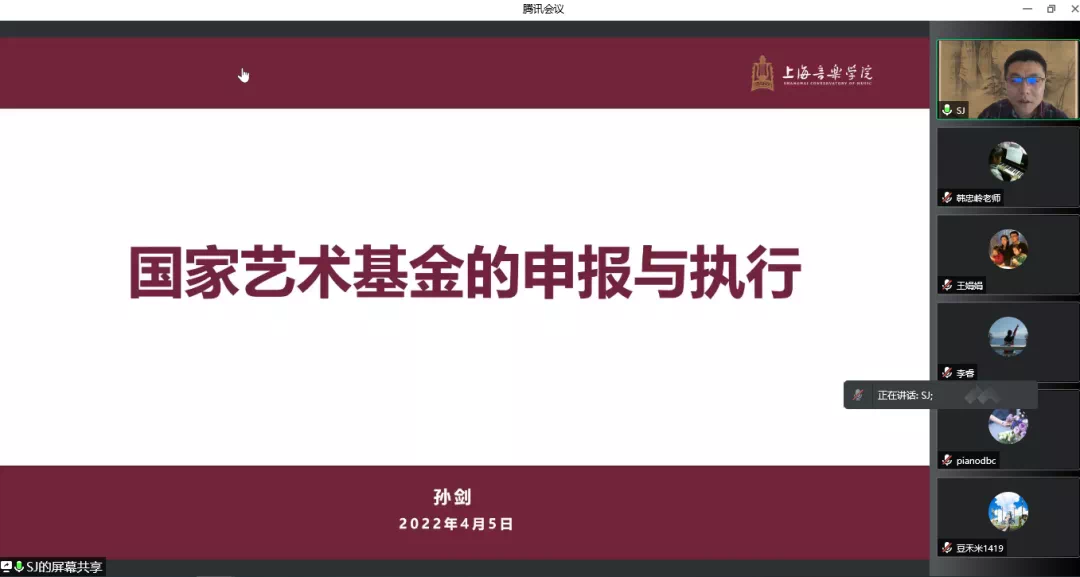 4月5日晚7时,音乐学院通过腾讯会议视频形式,召开2022年度国家艺术基金申报线上推进会,邀请了上海音乐学院科研处副处长孙剑博士作项目申报学术报告。王静怡院长参加了报告会议并讲话,副院长董博超主持了会议。