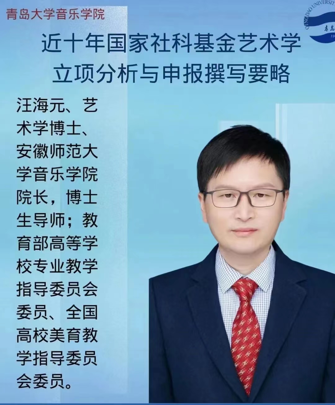 汪海元教授报告的题目为《近十年国家社科基金艺术学立项分析与申报撰写要略》。报告内容首先针对2013年至2022年十年间国家社科基金艺术学项目立项情况,从立项发展演变情况、研究类别变化、各年度获得立项数数据进行了详细的分析,从宏观层面阐述了近十年申报立项的情况。报告第二个内容专题讲解如何填写申报书,汪教授以自己申报成功的申报书填写为例,给与会学习老师们详细讲解了国家社科申报书填写的方法和技巧,给需要申报项目的老师带了十分直观有效的申报指导。报告第三方面重点讲解了申报选题设计技巧,以2022年艺术学音乐学科立项的选题为例,汪教授针对题目逐一展开分析,给老师们分享了选题的技巧和方法。
