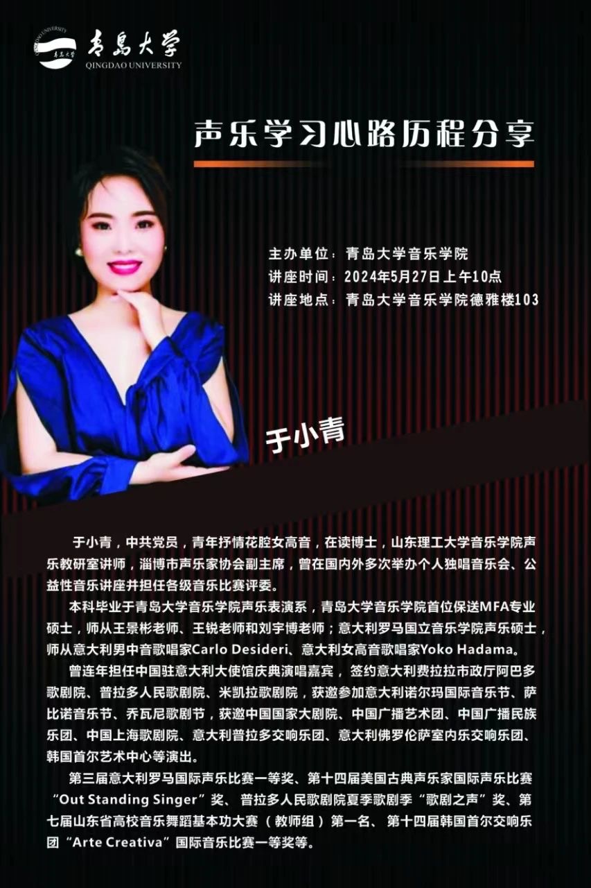 于小青,中共党员,青年抒情花腔女高音,在读博士,山东理工大学音乐学院声乐教研室讲师,淄博市声乐家协会副主席,曾在国内外多次举办个人独唱音乐会、公益性音乐讲座并担任各级音乐比赛评委。