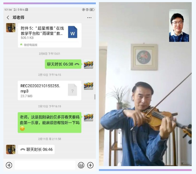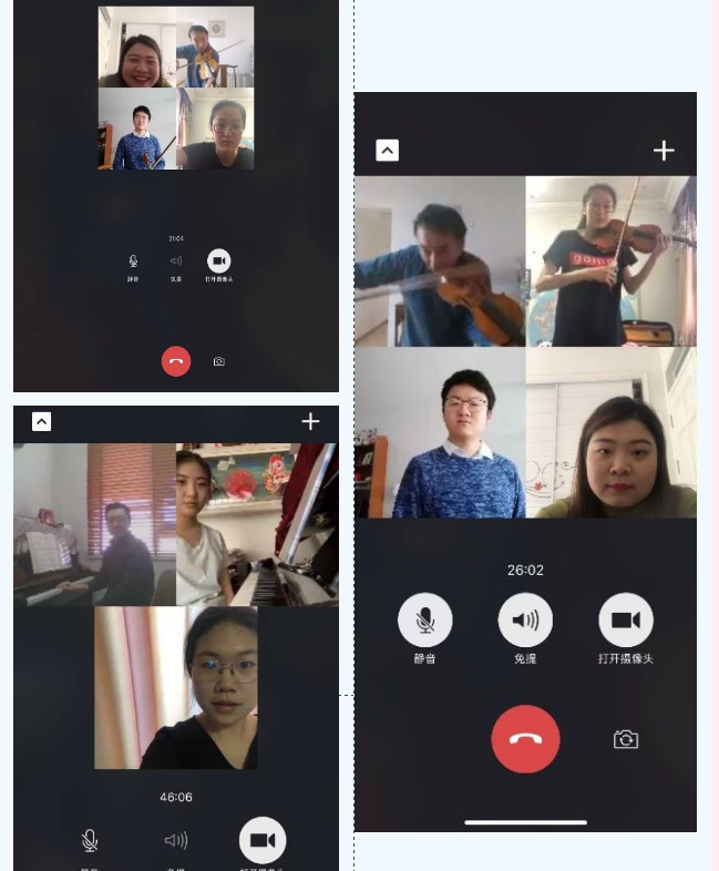 针对视频直播卡顿的问题,管弦系主任邓列加教授、键盘系杨佩胜等教师采用让学生提前上传作品视频,教师开展视频群聊的方式,讲解共性问题,再对学生的个别问题逐一指导。