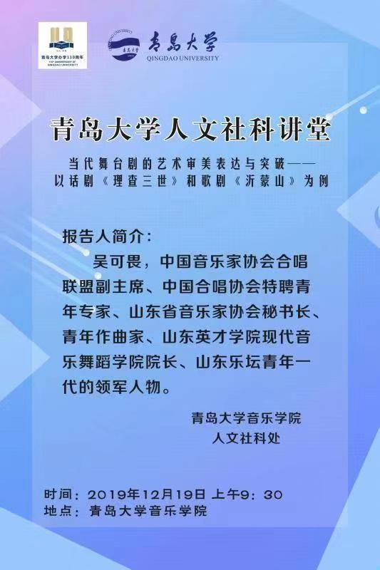 2019年12月19日上午,由吴可畏主讲的《当代舞台剧的审美表达——以话剧<查理三世>、歌剧<沂蒙山>、舞剧<永不消逝的电波>为例》讲座在自拍流出