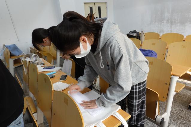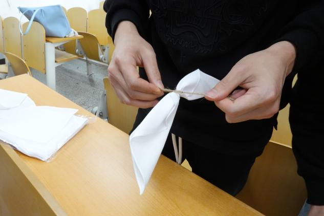 随后,闫旭老师向学生们分发提前准备好的手工布袋,上面有老师特意印制的音乐类图案,这大大激发了同学们对于扎染技术的学习兴趣。同学们按照花纹图案的要求,在布料上分别使用撮皱、折叠、翻卷、挤揪等方法,使之成为一定形状,用线将其扎紧,让布料变成一串串“疙瘩”,在同学们缠扎布料同时,闫旭老师为大家配置了染料。