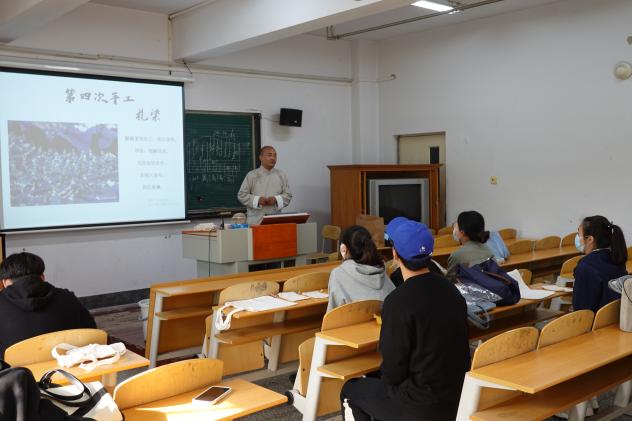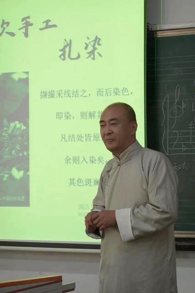 在课堂的学习过程中,闫旭老师首先为学生们讲解了在古诗文中有关扎染的出处,介绍了扎染的悠久历史,并特意身穿传统长衫为大家授课,在迅速活跃气氛的同时也营造了学习传统艺术的浓郁氛围。其次,闫旭老师向学生们介绍了几项传统染色方式,讲解了扎染基本步骤,使同学们对扎染有了初步了解。