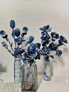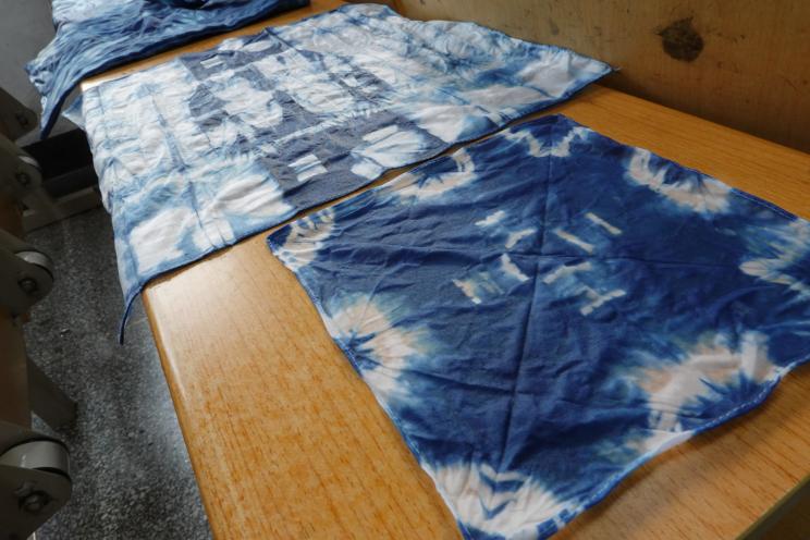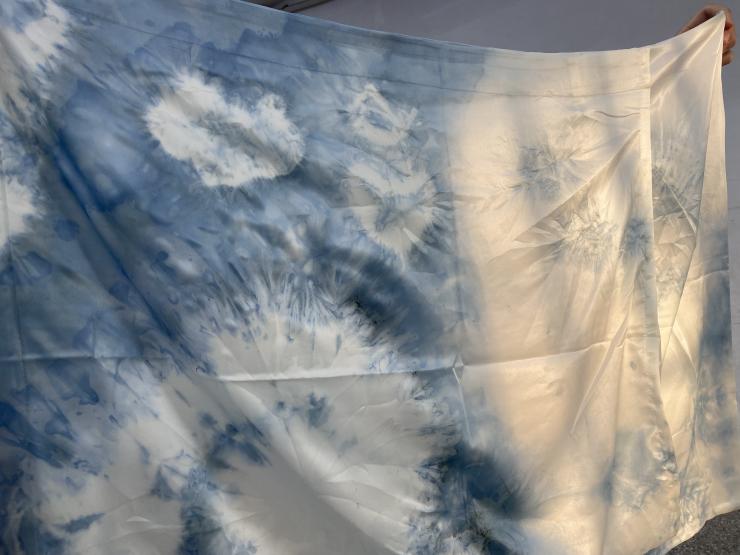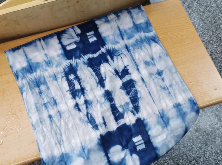 染料和布料都准备好以后,便真正开始“染”。闫旭老师指导大家将扎好的布料用清水浸泡后放入染缸,经一定时间后捞出。有趣的是,布料捞出的瞬间还是黄绿色,随后便以肉眼可见的速度氧化为蓝色。用线扎紧的部分,因染料浸染不到,自然成了好看的花纹图案,又因为松紧程度不同,染料浸染的程度也不一样,颜色便呈现出渐变的特征,并带有一定的随意性。每个人染出的成品都是独一无二的,有很多艺术意味。同学们的图案大多以花形为中心,变幻玄妙且有多层次晕纹,凝重素雅,古朴雅致。