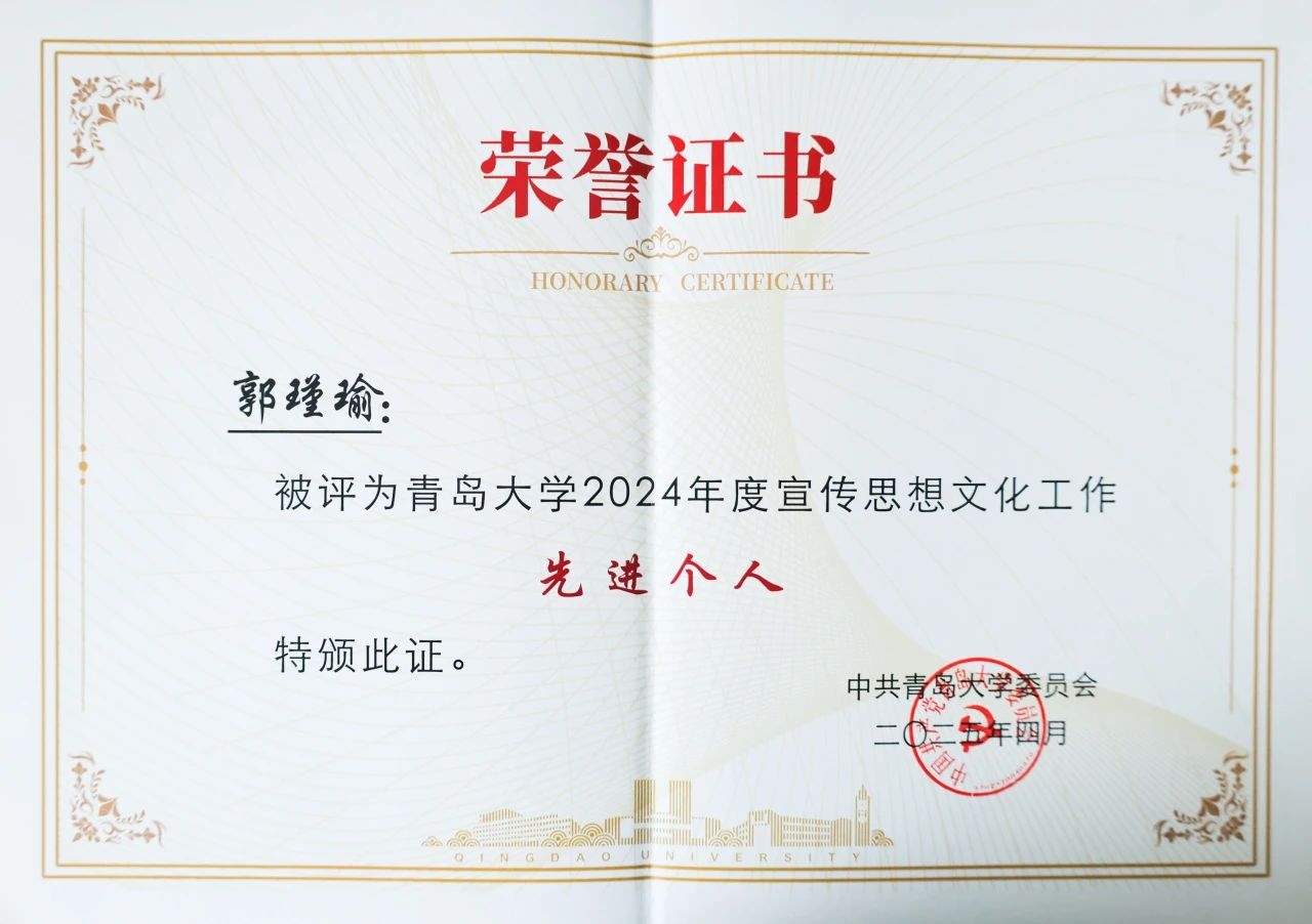 获得“2024年度宣传思想文化工作先进集体”、“优秀微信公众号”荣誉称号,新年音乐会与美润昆仑实践团荣获“第一届校园文化品牌”,我们的舞台——舞动青大荣获“第一届自拍流出