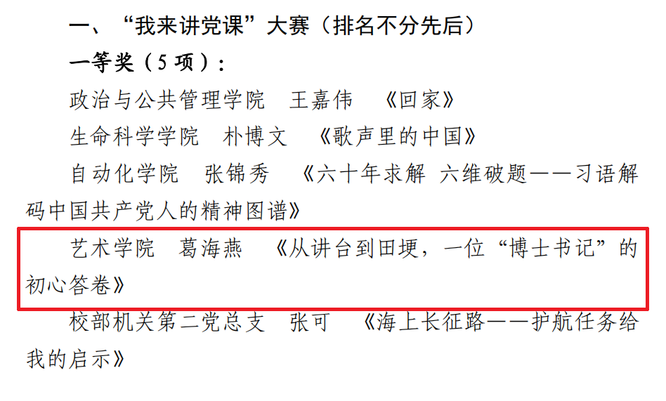 两位师生表现突出,其中葛海燕老师荣获“我来讲党课”大赛一等奖,荆双官同学荣获“我和我的支部”大赛一等奖共两项荣誉。