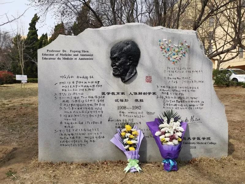 学习活动持续了约五十分钟,共分为三个环节的内容举行。首先在博雅楼西侧花园草坪处的沈福彭教授纪念浮雕前举行了祭奠仪式,党员代表向沈福彭教授石雕鲜花,全体党员面向沈教授石像鞠躬默哀致敬,随后聆听了医学部人体解剖学王守彪教授对沈福彭先生事迹的讲解介绍。