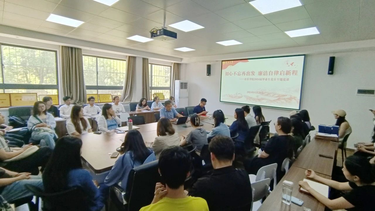 为进一步加强毕业生党员教育管理, 增强身份意识,提高党性修养,更好地发挥党员先锋模范作用。6月20日,音乐学院党委书记李建新以《初心不忘再出发,廉洁自律启新程》为题,为毕业生党员讲授专题党课。