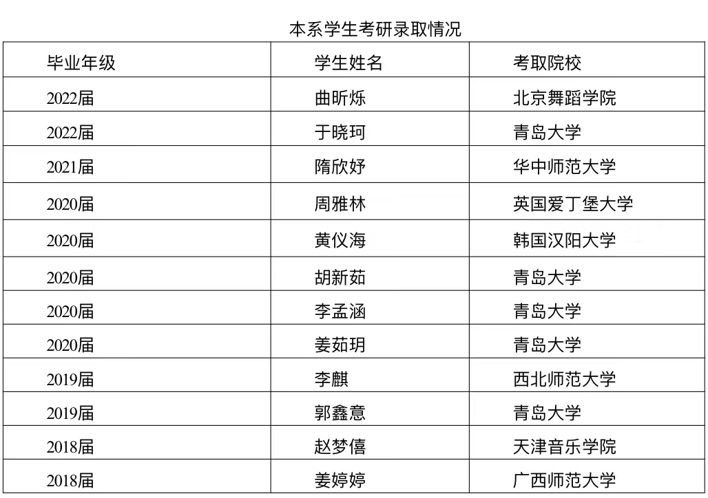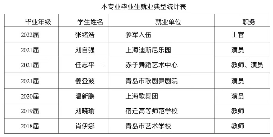 通过近十年的教学实践,在培养可持续发展人才基本原则的指导下,初步建立培养基础知识扎实、基本功过硬、实践能力强、善于创新的舞蹈表演人才的课程体系。通过严格的课程教学、训练和系统的艺术实践,学生在校期间即完成一系列舞蹈创作和演出,有效地丰富和活跃了校园文化,并屡屡在参加省、市和国际性的艺术文化活动中斩露头角。2018、2019年,本专业学生在山东舞蹈家协会举办的山东省青年舞蹈大赛中获得多个奖项。2018年文化大发展大繁荣为艺术教育提供了广阔空间,迎来了新的发展机遇,同时提高了艺术类学生就业率。如:专业自拍流出