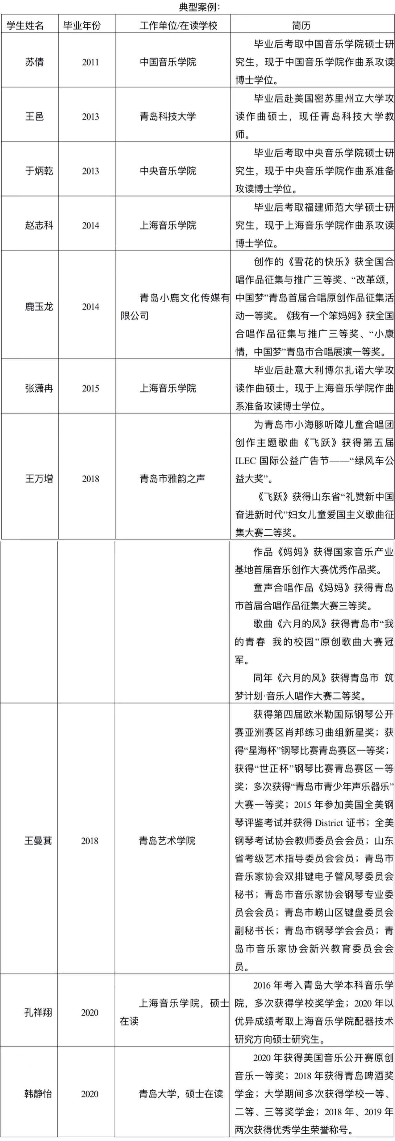 近年来,我系的毕业生有些已考取国内外音乐院校的研究生,继续攻读硕士和博士学位,有些到地方群艺馆、各中小学、音乐培训机构、唱片公司等就业,还有些同学在毕业后选择自主创业,创立了自己的学校、公司或琴行,继续从事音乐普及教育工作,为繁荣区域文化建设做出了应有的努力。