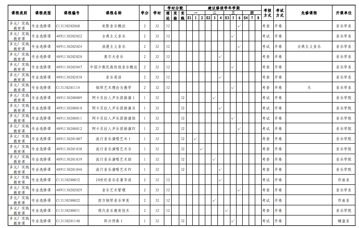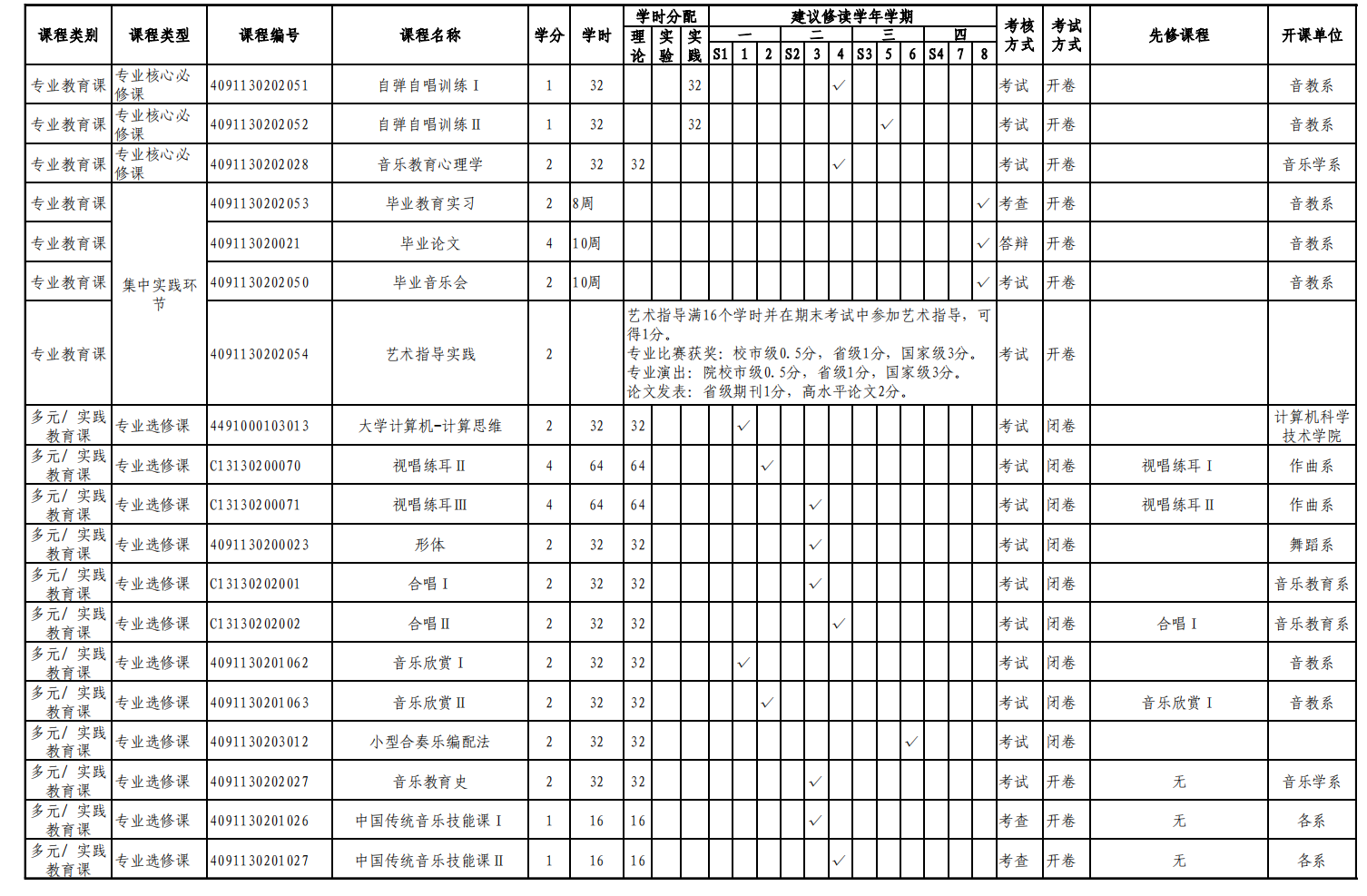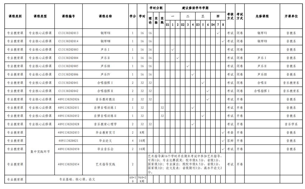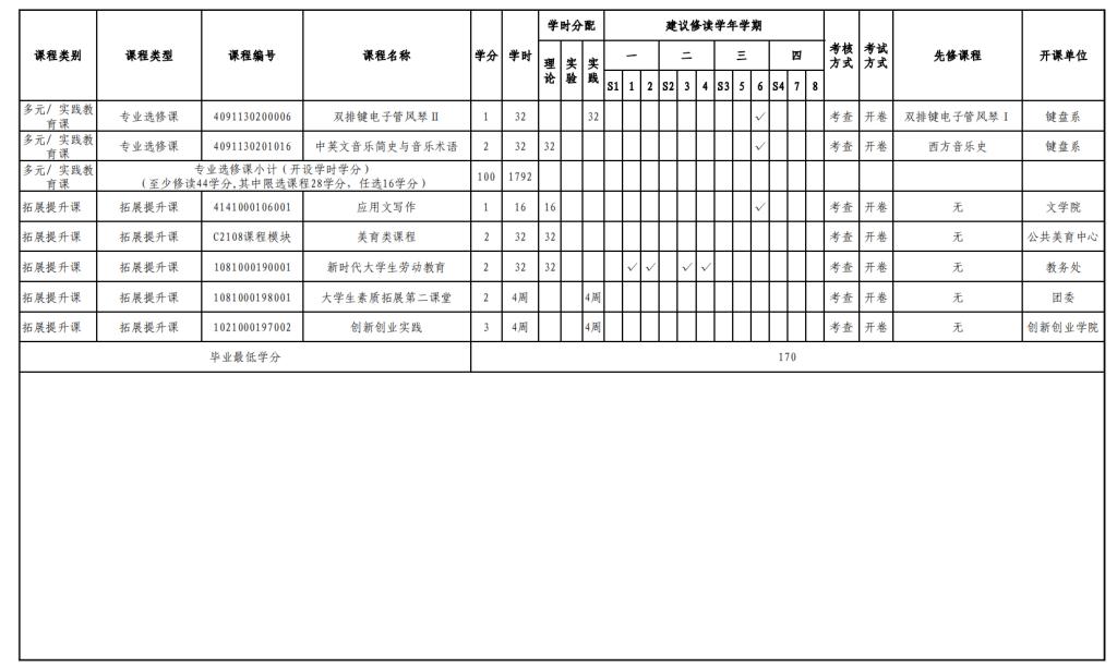实验实践课学时学分安排表——音乐教育键盘、声乐方向