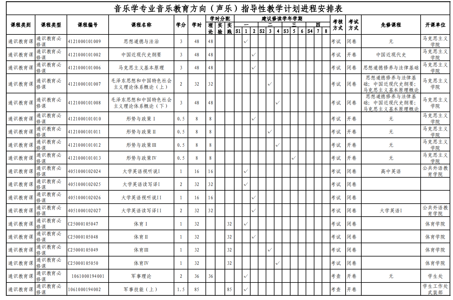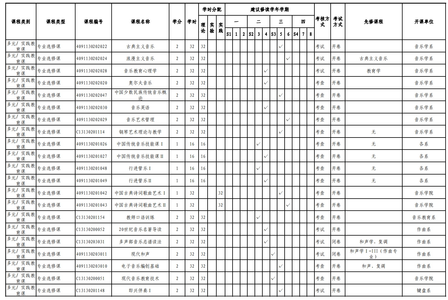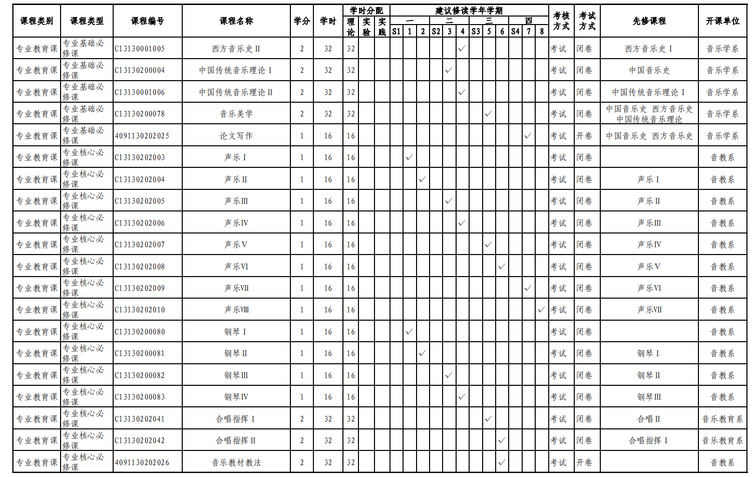 实验实践课学时学分安排表——音乐教育键盘、声乐方向
