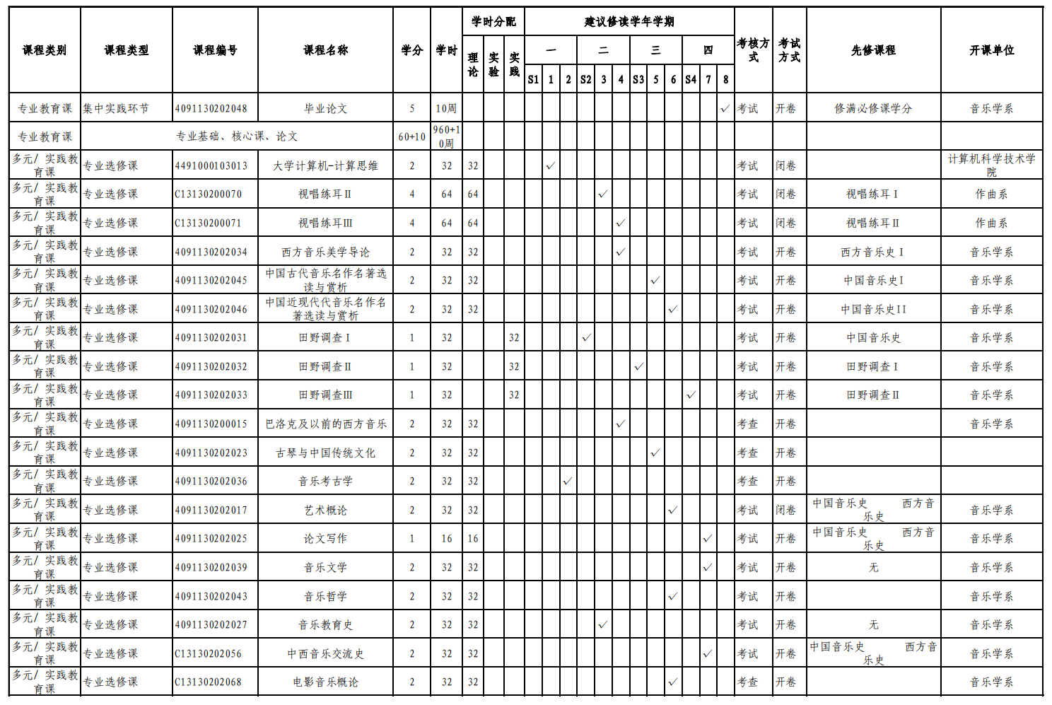 实验实践课学时学分安排表——音乐学理论方向