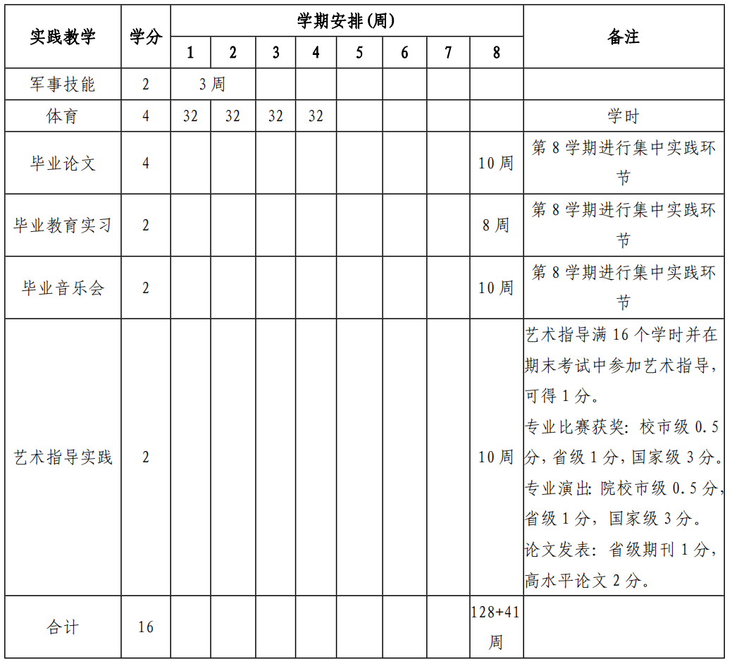 (2)音乐学理论专业修满相关实践学分 5 分。(完成田野报告 1 学分;音乐评论或观摩评论第 2、3 学期各完成 1 篇,第 4、5、6、7 学期各完成 2 篇,共完成 10 篇 2 学分;论文发表:省级期刊 1 分,高水平论文 2 分。学术交流活动参会 0.5 分,发言 1 分,最多可得 2 学分;参加艺术活动志愿服务校级 4 次,可获得 1 学分,市级及以上 2 次,可获得 1 学分,国家级 1 次,可获得 1 学分,需有证明材料或证书。第 8 学期认定学分。)音乐教育专业修满相关实践学分 2 分。(艺术指导满 16 个学时并在期末考试中参加艺术指导,可得 1 分。)专业比赛获奖:校市级 0.5 分,省级 1 分,国家级 3 分。专业演出:院校市级 0.5 分,省级 1 分,国家级 3 分。论文发表:省级期刊 1分,高水平论文 2 分。)