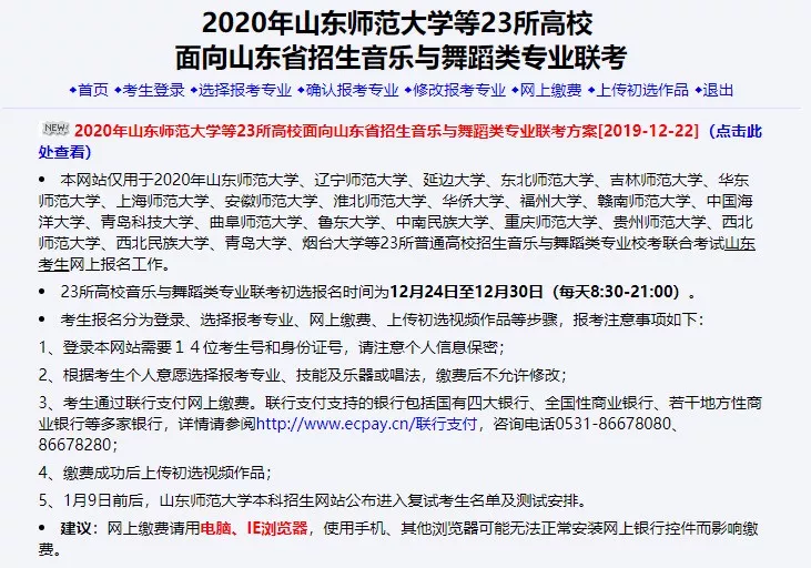 2、缴费成功方可上传初选视频作品。视频须按照《2020年山东师范大学等23所高校面向山东省招生音乐与舞蹈类专业联考方案》要求录制。