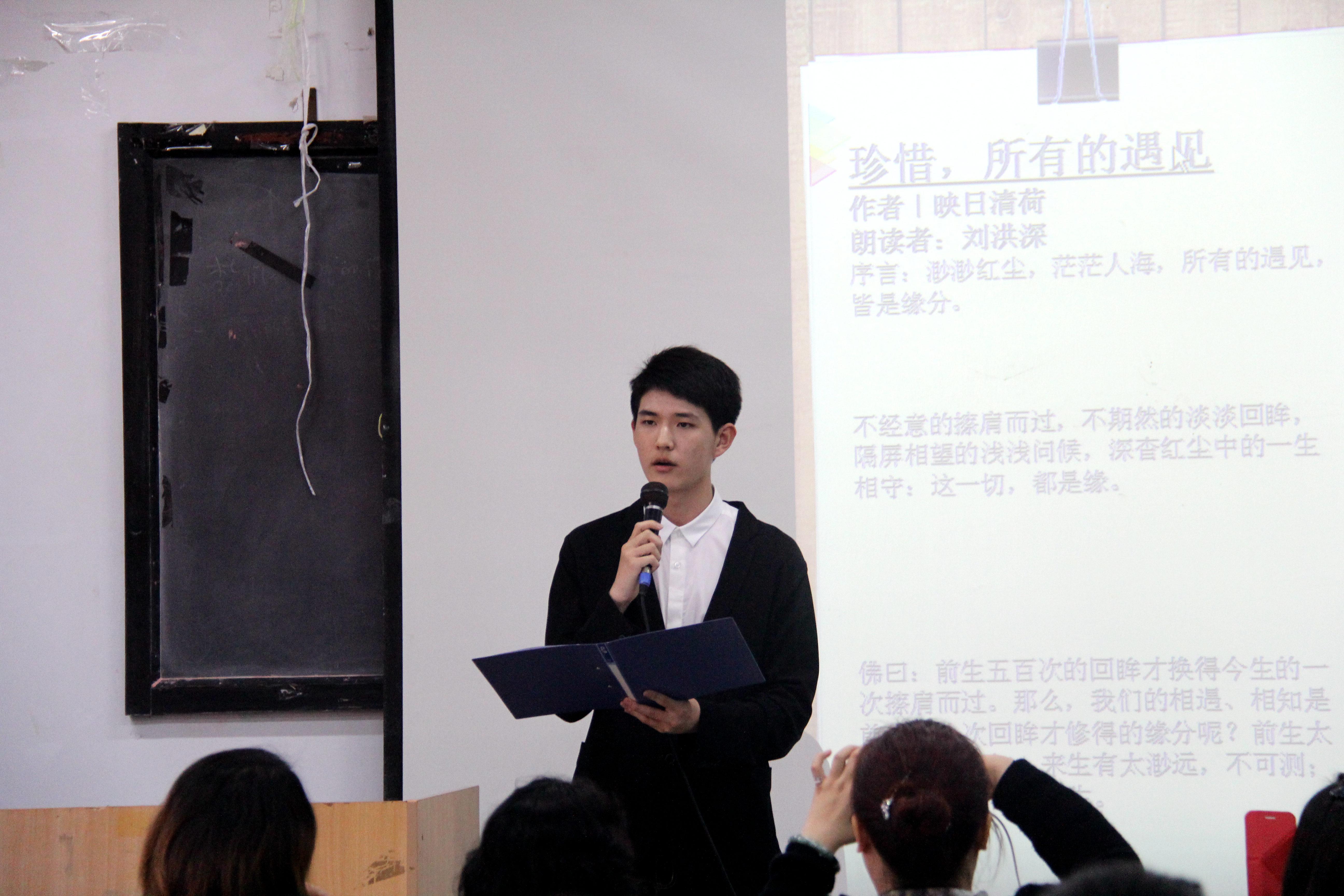 4月17日下午,美术学院在德雅楼302室举行了“书香美院,悦读人生”朗读比赛系列活动——遇见,美术学院党委书记王有全,党委副书记甄淑华、辅导员以及2016级环境设计系学生参加活动。