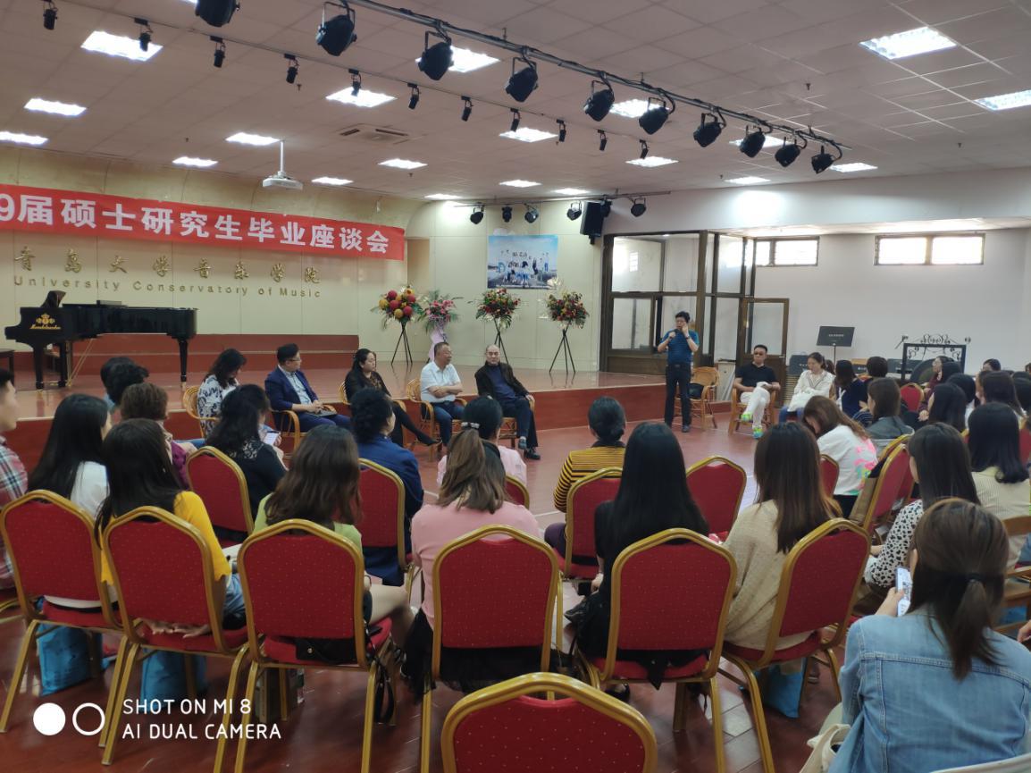 5月23日下午,音乐学院在德雅楼103排练厅举行“音为有你 乐在未来”2019届硕士研究生毕业生座谈会。音乐学院党委书记姜世安、院长王静怡、党委副书记司现鹏、副院长孟雷、院长助理李晓囡,学工办主任迟晓波,6名导师代表、28名2019届毕业生及部分2017级研究生代表参加了座谈会,座谈会由副院长孟雷主持。