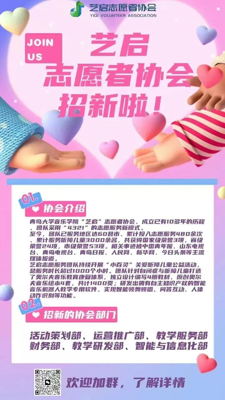 “艺启”志愿者协会成立已有10多年的历程。团队采用“4321”的志愿服务新模式, 即充分发挥“学生志愿者、教师、校友、家长”四个方面的力量;以“党建红”引 领团队成长、以“金牌黄”为目标导向、以“青岛蓝”辐射全国;重点针对儿童和 老人两个群体。