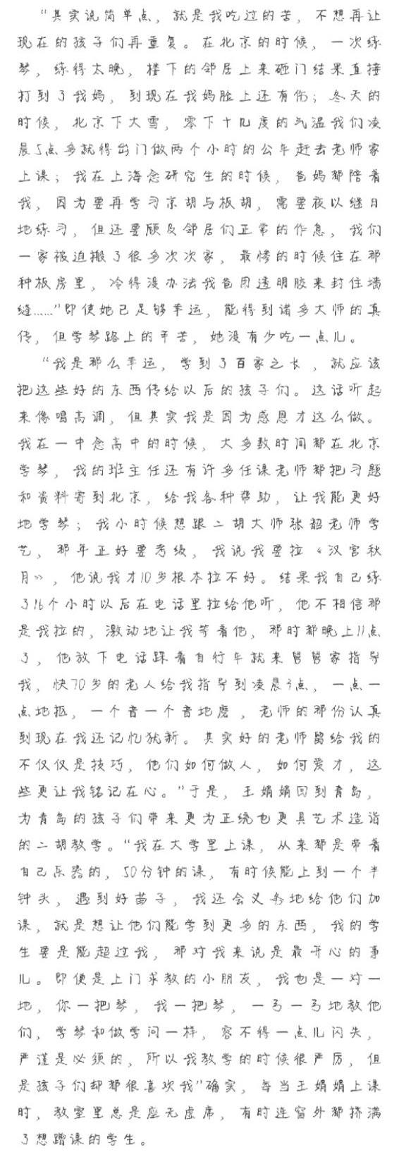 艺术经历:王娟娟的演奏风格博采众长,声情并茂,弓弦凝练,音色深邃,曾多次举行国内及国际巡演,主要国家包括:德国、奥地利、法国、英国、比利时、瑞士、荷兰、日本、韩国、菲律宾等地,并多次在欧洲、上海、青岛成功举办个人独奏音乐会,与胡琴大师张玉明教授共同录制的“爱艺术——跟着全世界艺术家学艺术”专题讲座,已上线并全球发行。曾举办中国民族器乐艺术专题讲座百余场。2019年、2020年两年期间在青岛电台、电视台直播二胡演奏及理论课程近百期。