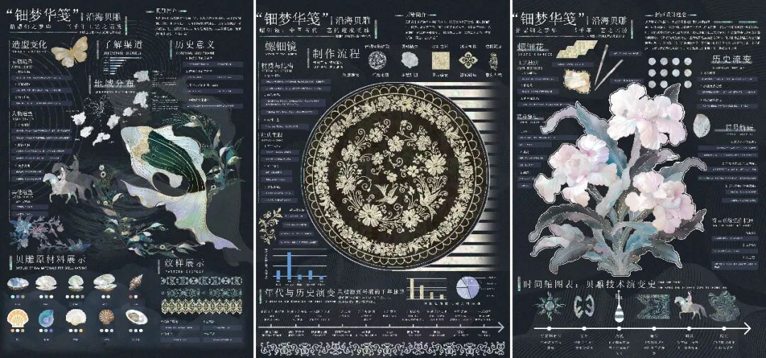 2025年中国研究生“美丽中国”创新设计大赛中,艺术学院魏子又同学的《钿梦华笺》(获“全国十佳”),以“非遗螺钿工艺+新时代图像技术”为核心,通过实地调研破解传承痛点,凭借“智辅钿作”创新创作三大主题作品,并联动青岛地铁、山东黄金推进产教融合,走进新疆小学开展美育,实现工艺创新与文化传播的闭环。