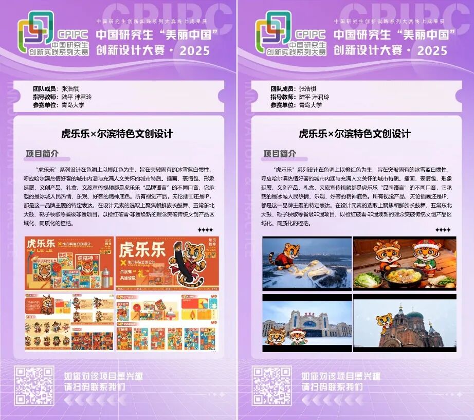 张浩祺同学的《虎乐乐×尔滨特色文创设计》以橙红色为核心,打破哈尔滨的冬日冷感叙事,通过兄妹双IP模式展现地域文化魅力。哥哥形象融合狍角帽等传统元素,化身冰雪运动使者;妹妹则以非遗符号与民俗细节为潮流担当,通过表情包实现轻量化传播。双IP设计在保持统一识别度的同时,有效构建了高效的文化传播矩阵。
