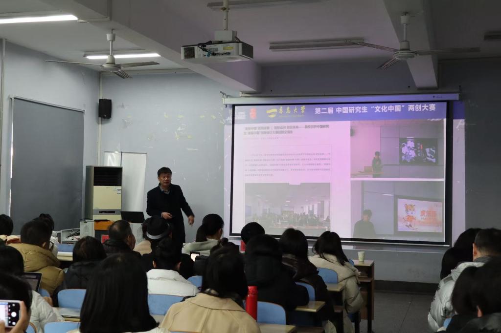 研究生院泮君玲老师解读了中国研究生创新实践大赛的相关政策,鼓励学院深化“艺术+科技”创新,将高水平赛事融入人才培养。随后,在“文化中国”两创大赛中获全国一等奖的学生团队进行了路演分享,指导教师陆平教授从赛事指导、课程融合等方面介绍了“以赛促教、以赛促学”的育人经验。