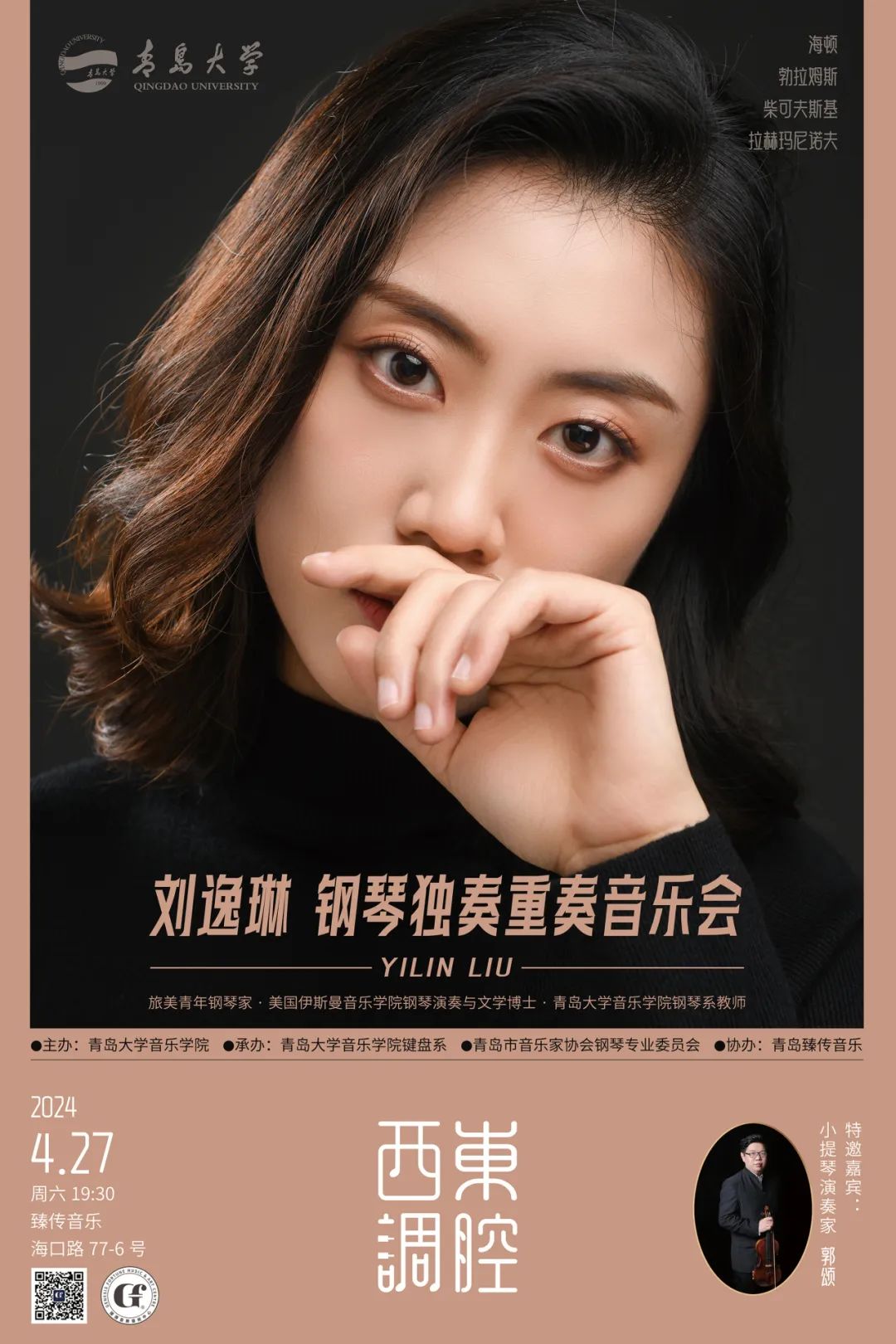 郭颂,高校教师,青年小提琴演奏家。毕业于上海音乐学院,师从小提琴教育家,演奏家俞丽拿教授。曾获全国室内乐比赛二等奖,奏鸣曲比赛奖等。曾于上海音乐厅以及青岛音乐厅举办个人独奏音乐会。参加上海交响乐团“青年音乐家腾飞计划”并获得入选。近年来受邀参与参与上海交响乐团,上海爱乐乐团,澳门交响乐团,德国斯图加特广播交响乐团的交响乐排练演出活动。并与青岛歌舞剧院交响乐团,上海友谊爱乐乐团等乐团进行合奏独奏演出,所指导学生考入海内外各大音乐学府。