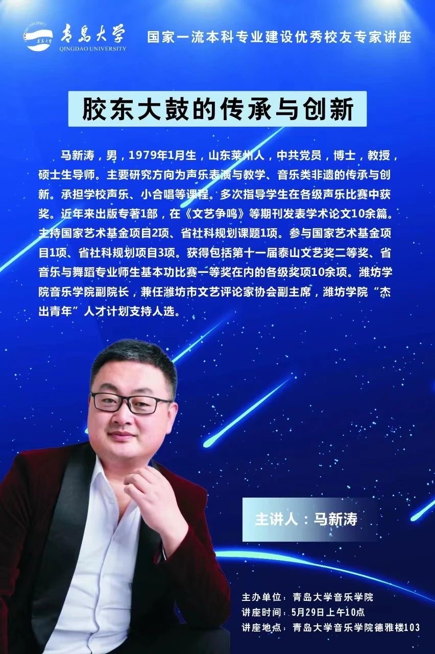 马新涛,男,1979年1月生,山东莱州人,中共党员,博士,教授,硕士生导师。主要研究方向为声乐表演与教学、音乐类非遗的传承与创新。承担学校声乐、小合唱等课程。多次指导学生在各级声乐比赛中获奖。近年来出版专著1部,在《文艺争鸣》等期刊发表学术论文10余篇。主持国家艺术基金项自2项、省社科规划课题1项。参与国家艺术基金项目1项、省社科规划项自3项。获得包括第十一届泰山文艺奖二等奖、省音乐与舞蹈专业师生基本功比赛一等奖在内的各级奖项10余项。潍坊学院音乐学院副院长,兼任潍坊市文艺评论家协会副主席,潍坊学院“杰出青年”人才计划支持人选。