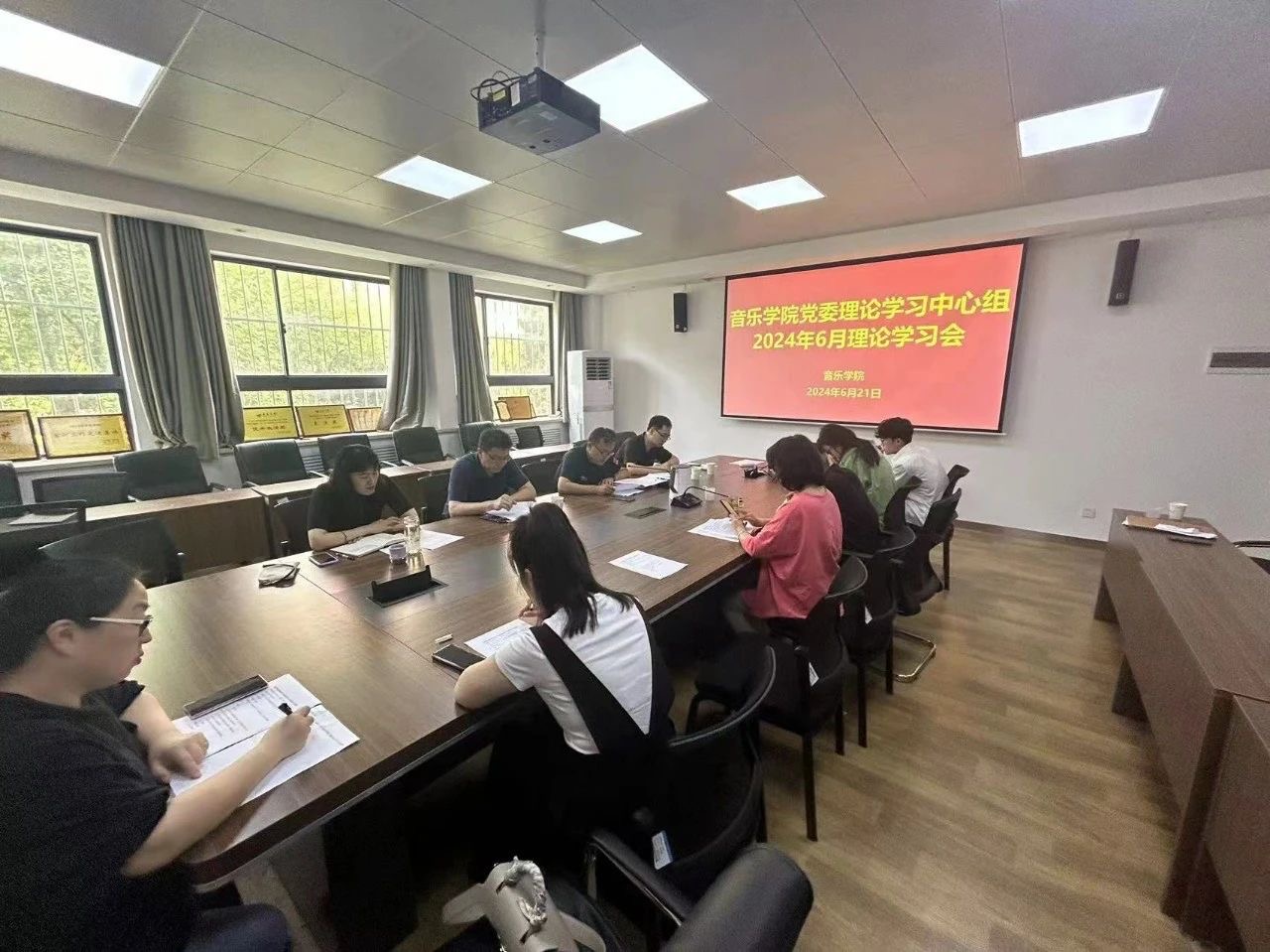 2024年6月21日上午,音乐学院党委理论学习中心组2024年第6次理论学习会在德雅楼二楼会议室召开,会议以学习习近平总书记视察山东重要讲话精神、传达学习学校第四次党代会精神为主题。学院党委书记李建新主持会议,学院党委理论学习中心组全体成员、各办公室主任、全体辅导员参加会议。