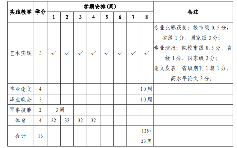 (1)教学实践:舞蹈理论实践(舞蹈评论、田野考察、舞蹈理论研究与创新)、舞蹈教学实践、毕业实习(含毕业供需展示)和毕业论文等。