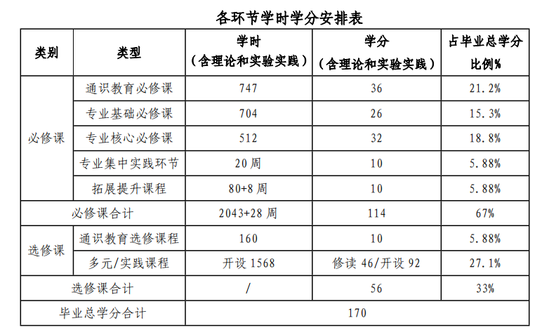 学生在完成规定的必修课程和总学分外,拓展提升项目和第二课堂达标后方可毕业。完成规定的必修课程和达到总学分 170 学分。