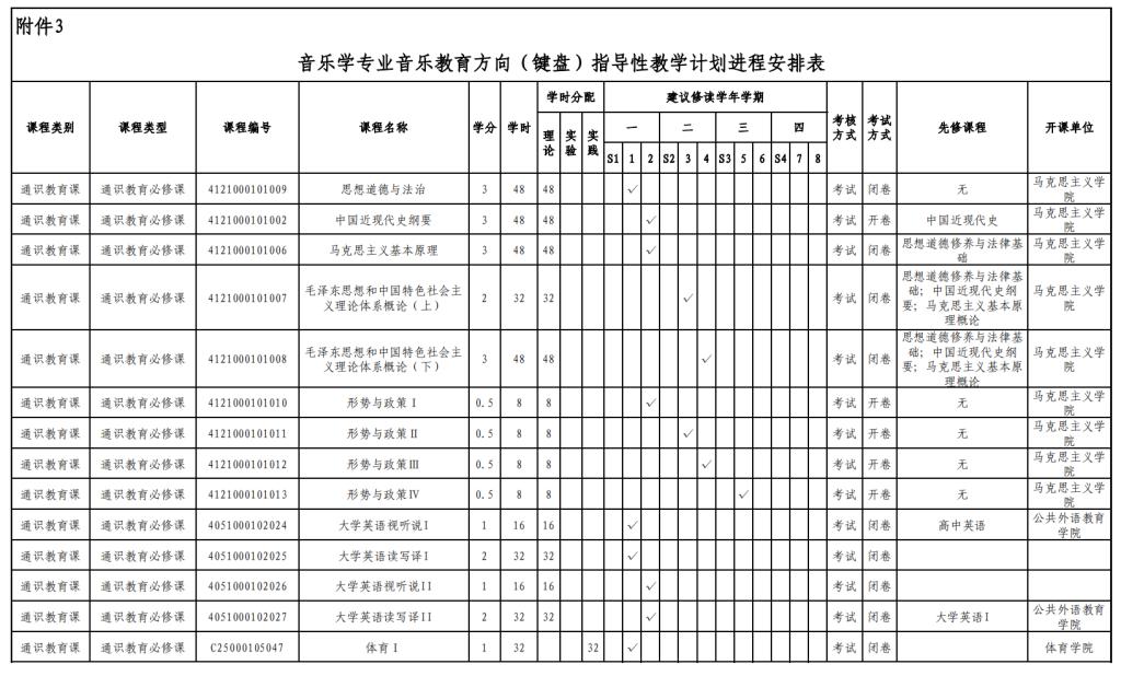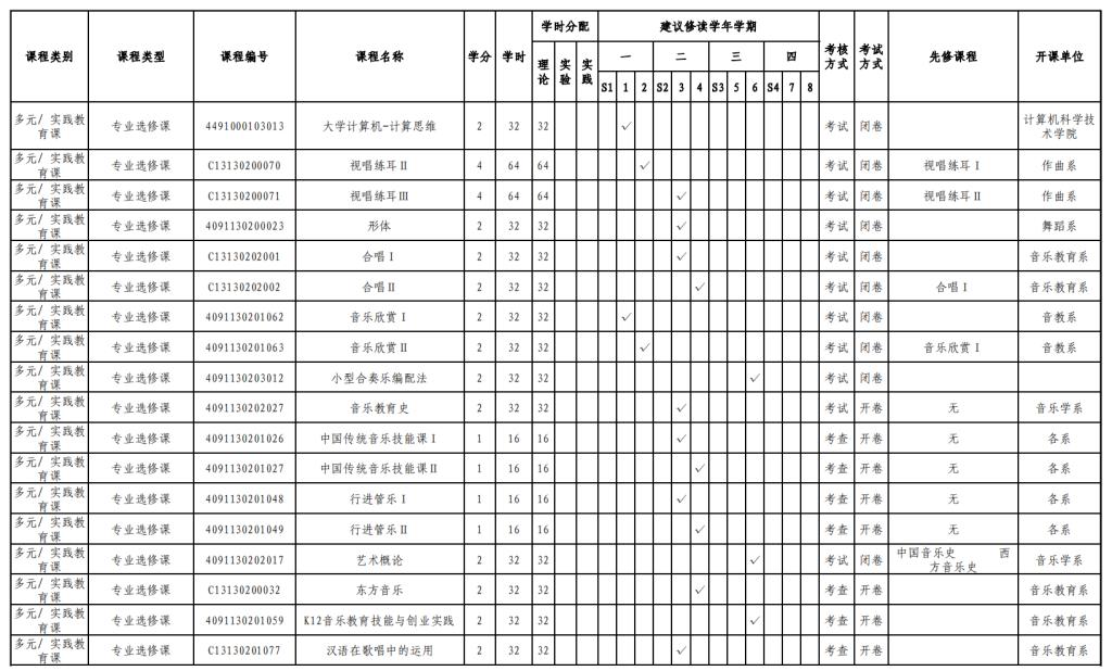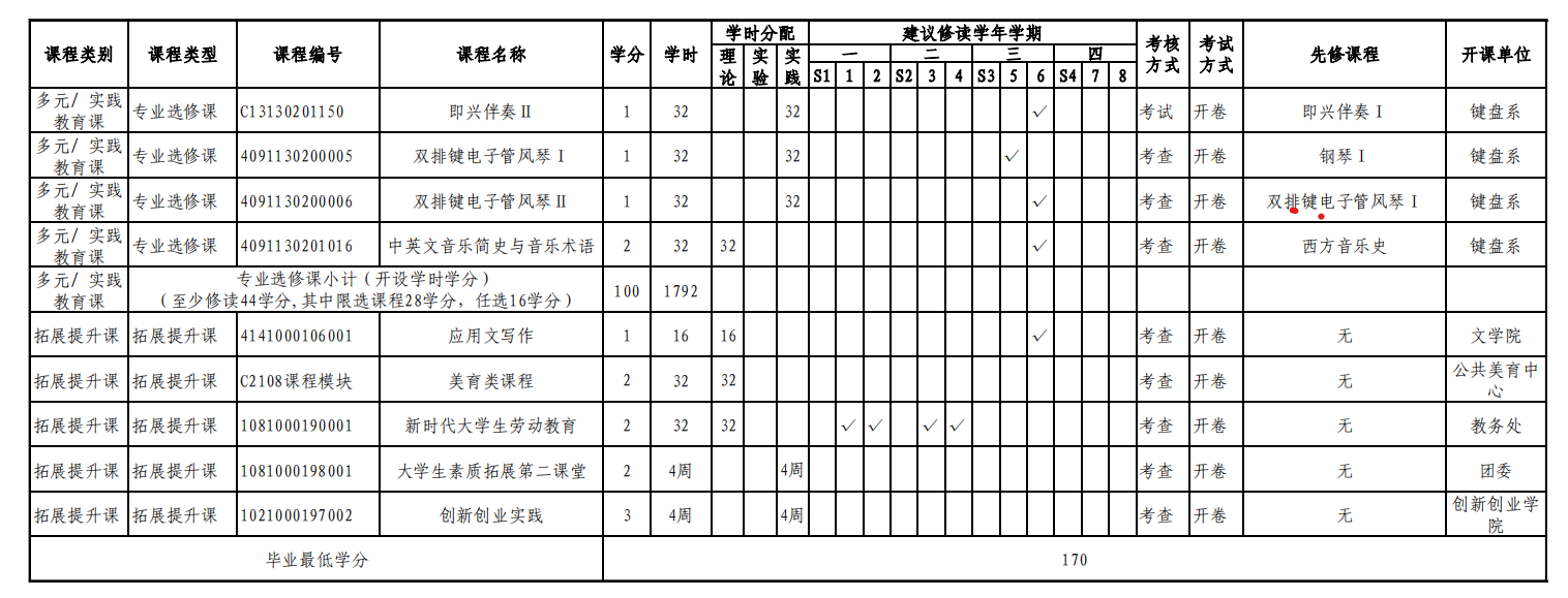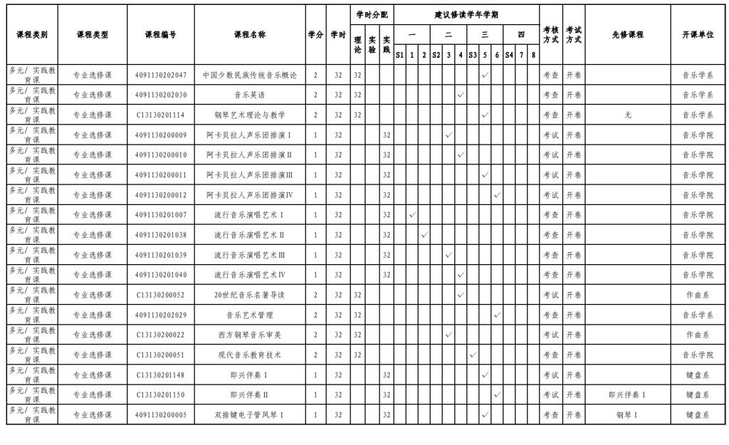 实验实践课学时学分安排表——音乐教育键盘、声乐方向