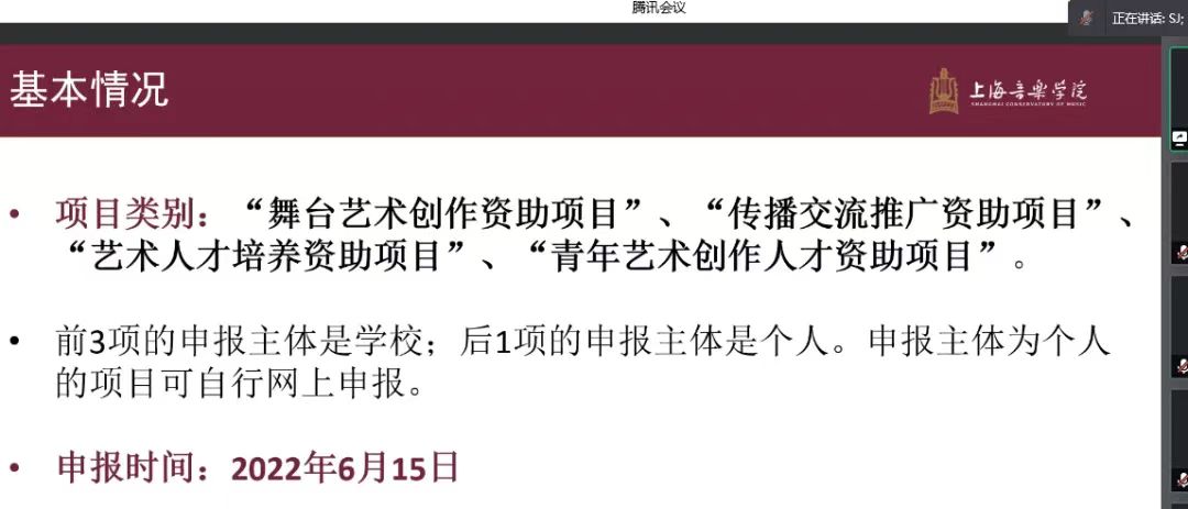 4月5日晚7时,音乐学院通过腾讯会议视频形式,召开2022年度国家艺术基金申报线上推进会,邀请了上海音乐学院科研处副处长孙剑博士作项目申报学术报告。王静怡院长参加了报告会议并讲话,副院长董博超主持了会议。